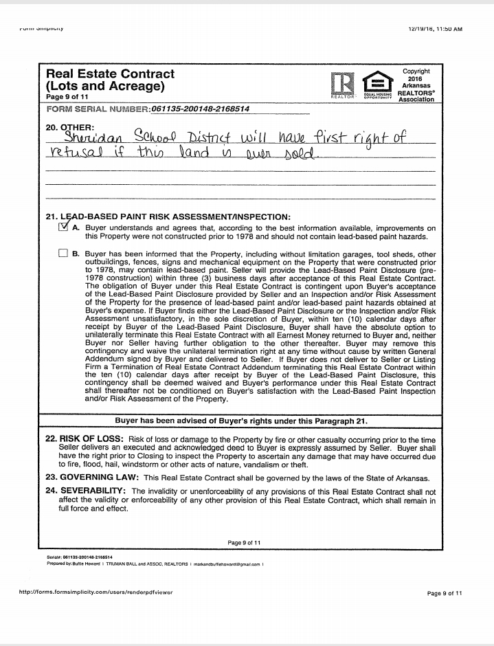 The only mention of the Sheridan School District in the real estate contract is on page 9 in Section 20. The school is listed as “Other”. It also states: “Sheridan School District will have first right of refusal if this land is ever sold." That statement is handwritten into the document.