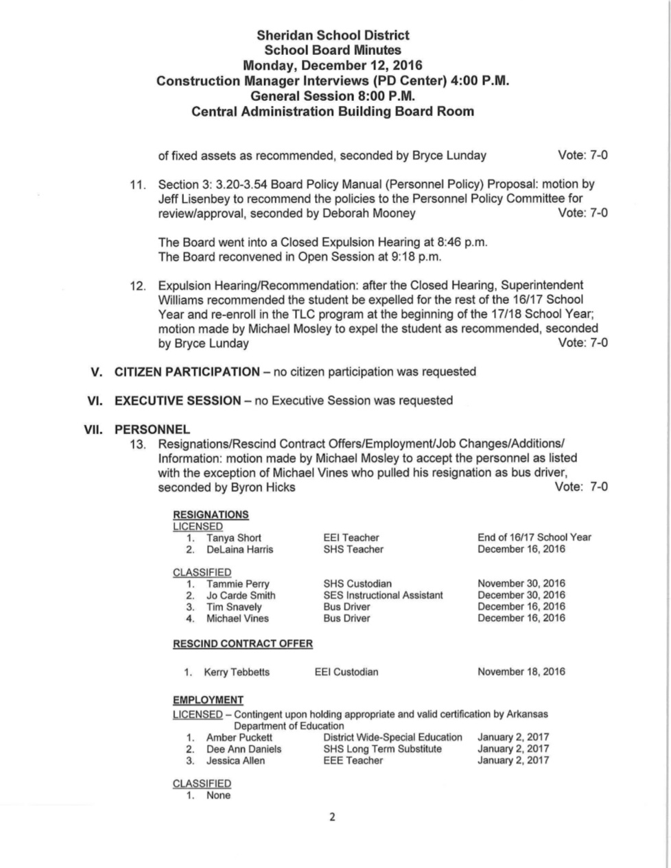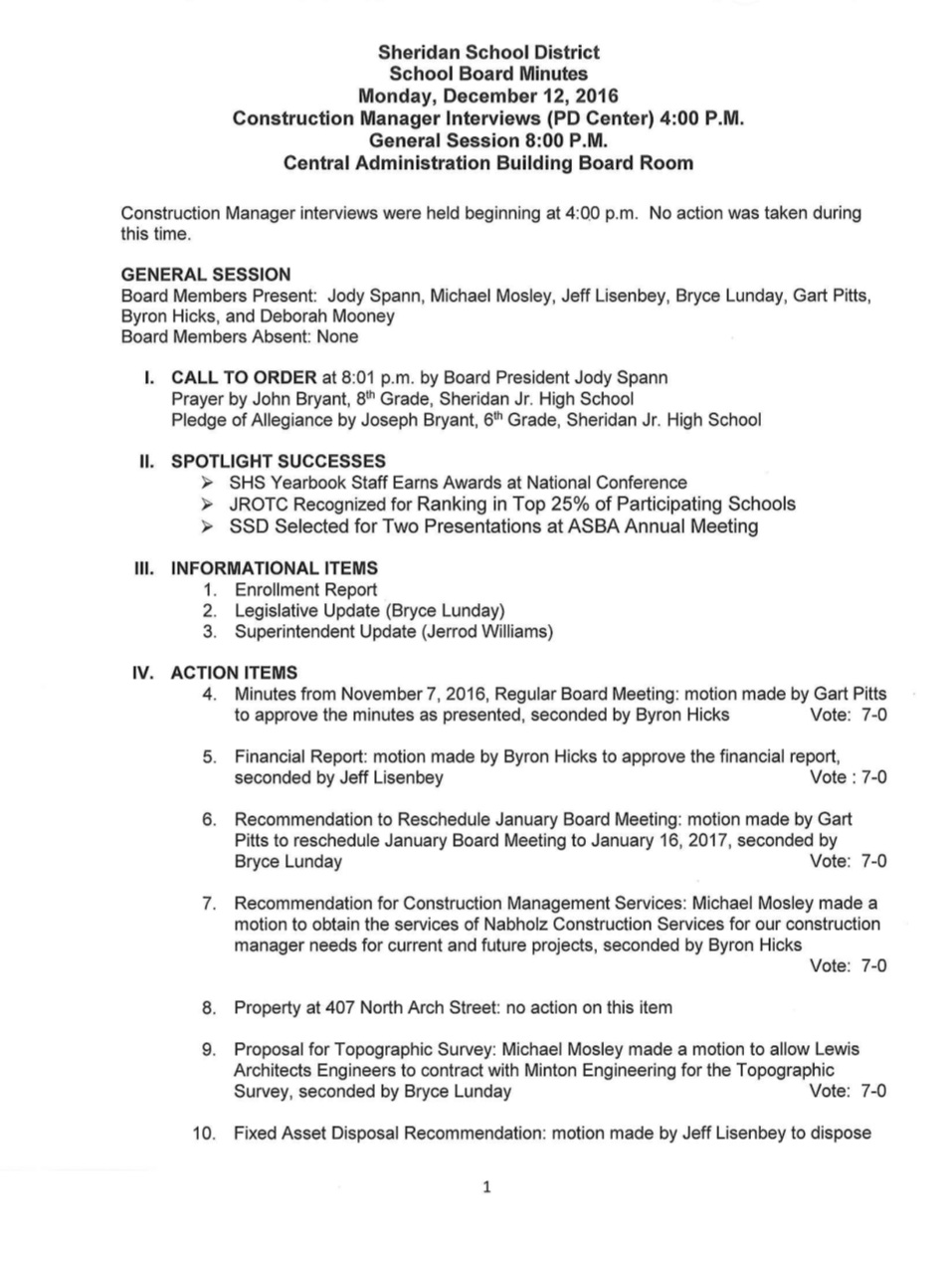 On Dec. 12, 2016, the board held its regular monthly meeting in its Central Administration Building’s boardroom. The November minutes were approved. The financial report was approved. The board voted 7-0 to obtain the services of Nabholz Construction Services in Conway for “current and future projects.”