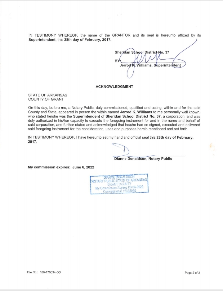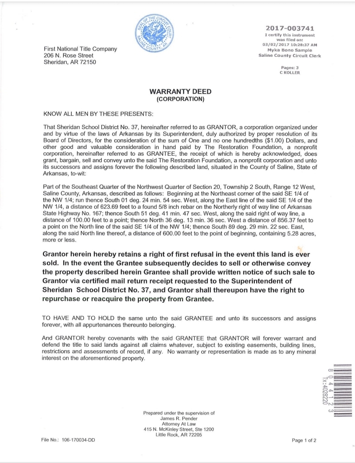 In the warranty deed’s bold portion, the school failed to enter the language recommended by the school’s attorney that would allow the district to repurchase the property at the selling price. The deed was executed Feb. 28, 2017, and filed March 2 in the Saline County Courthouse.