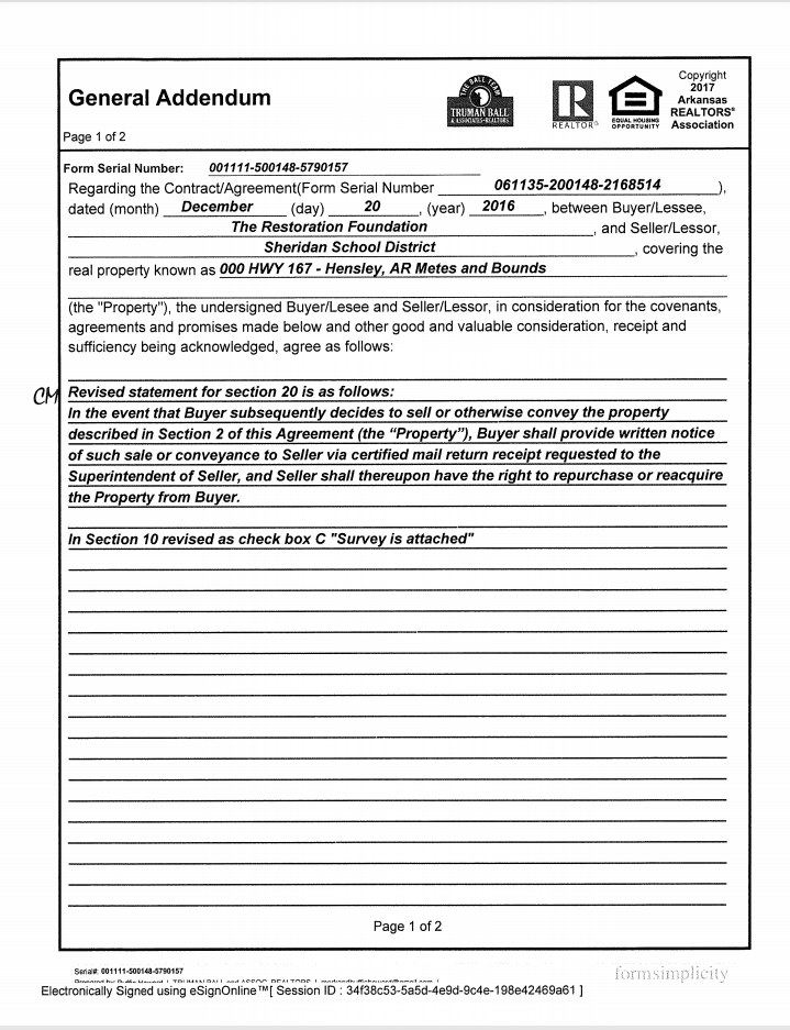 Section 20 is found in the real estate contract dated Dec. 20, 2016, between The Restoration Foundation and Truman Ball. In the general addendum to the December real estate contract, Section 20 is revised without the complete language requested by the school’s attorney.