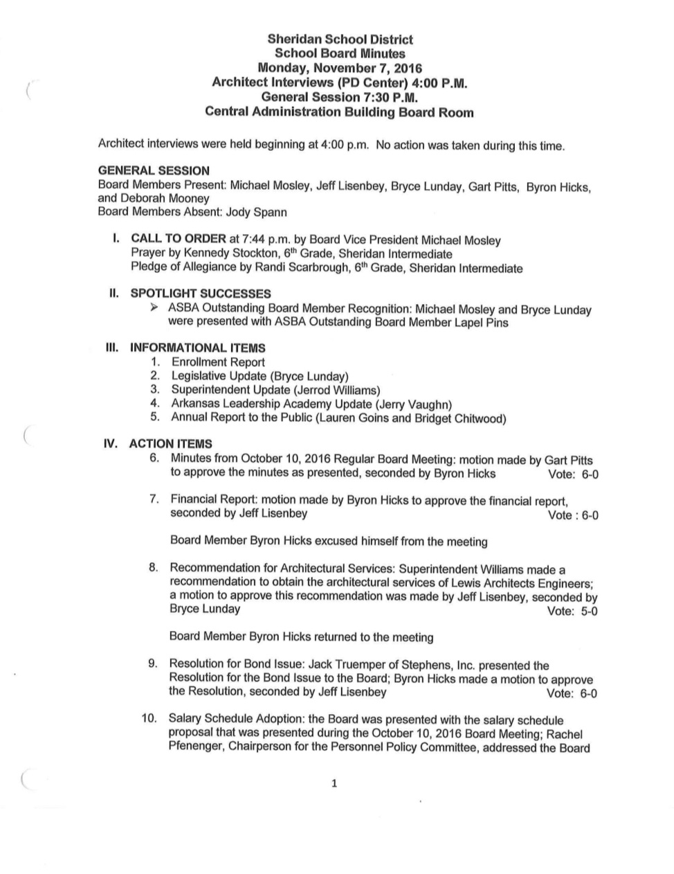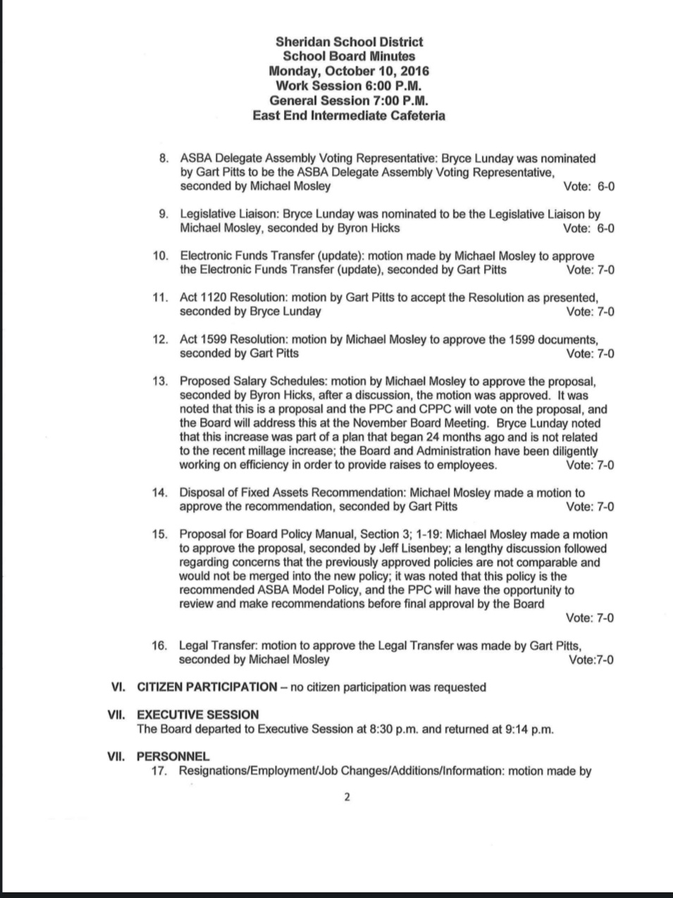 Action Item 8 stated, “Proposal for sale of property: motion made by Gart Pitts to authorize Superintendent Williams to proceed with sale of property as presented, seconded by Jeff Lisenbey Vote 7-0.”