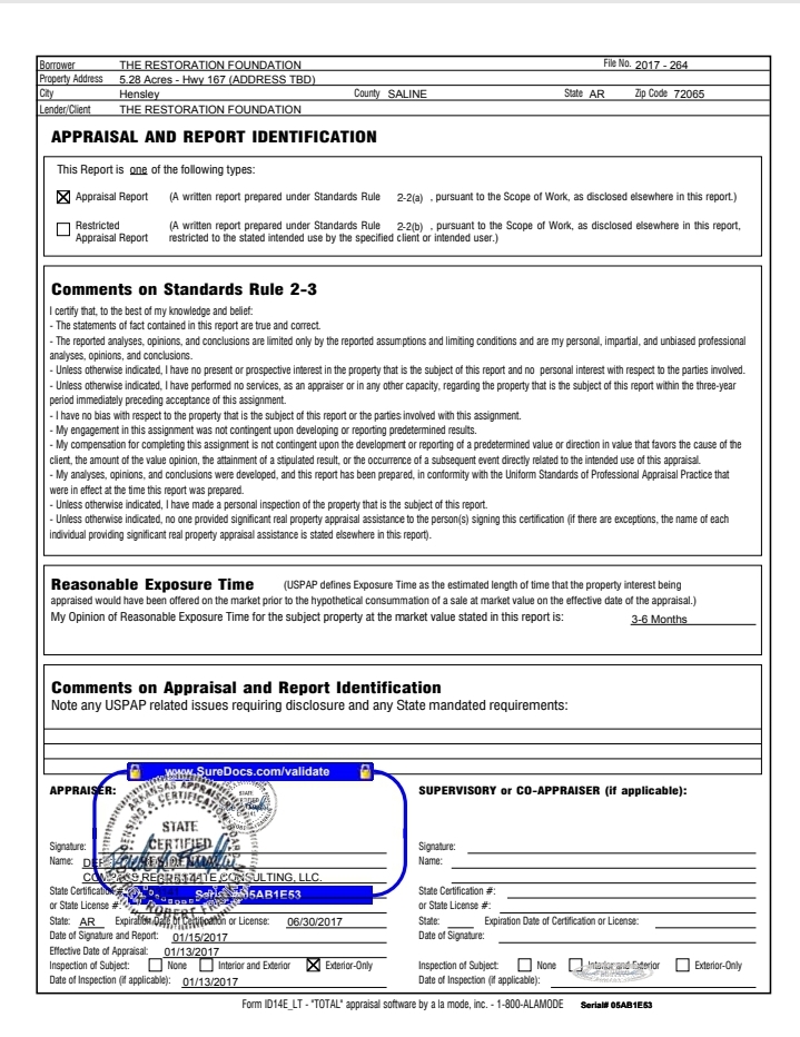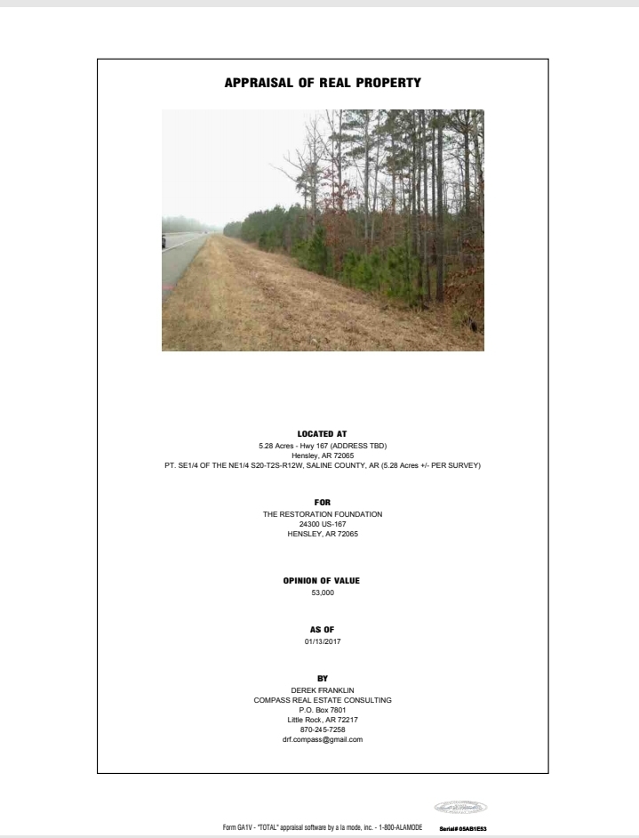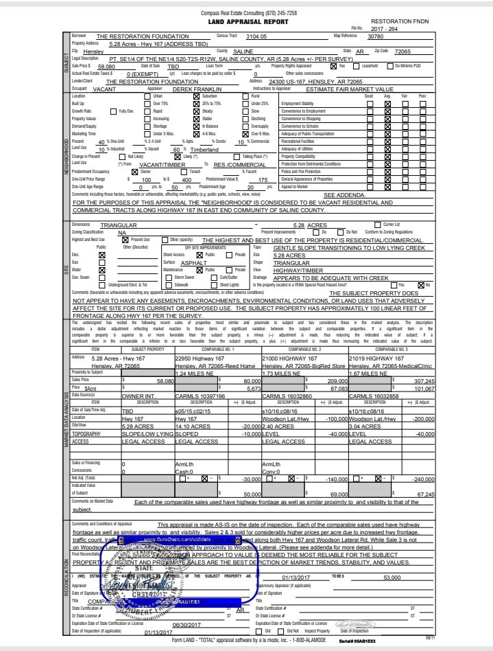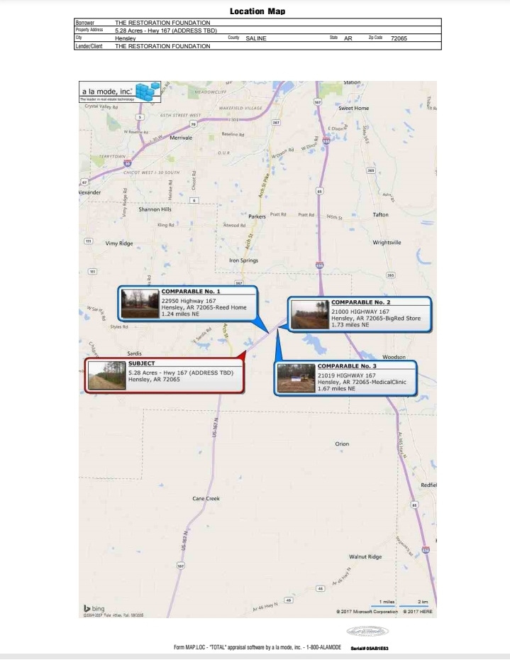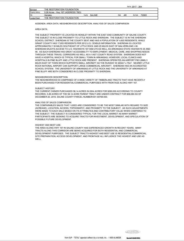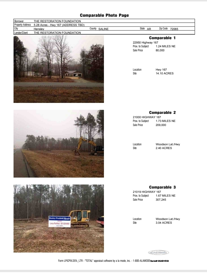 The appraiser wrote, “Highest and best use: The area along Hwy 167 in Saline County has experienced growth in recent years. Many tracts along this corridor are being acquired for both residential and commercial development purposes. The subject tracts highest and best use is residential/commercial site preparation, access development, and frontage all influence the highest and use as well.”