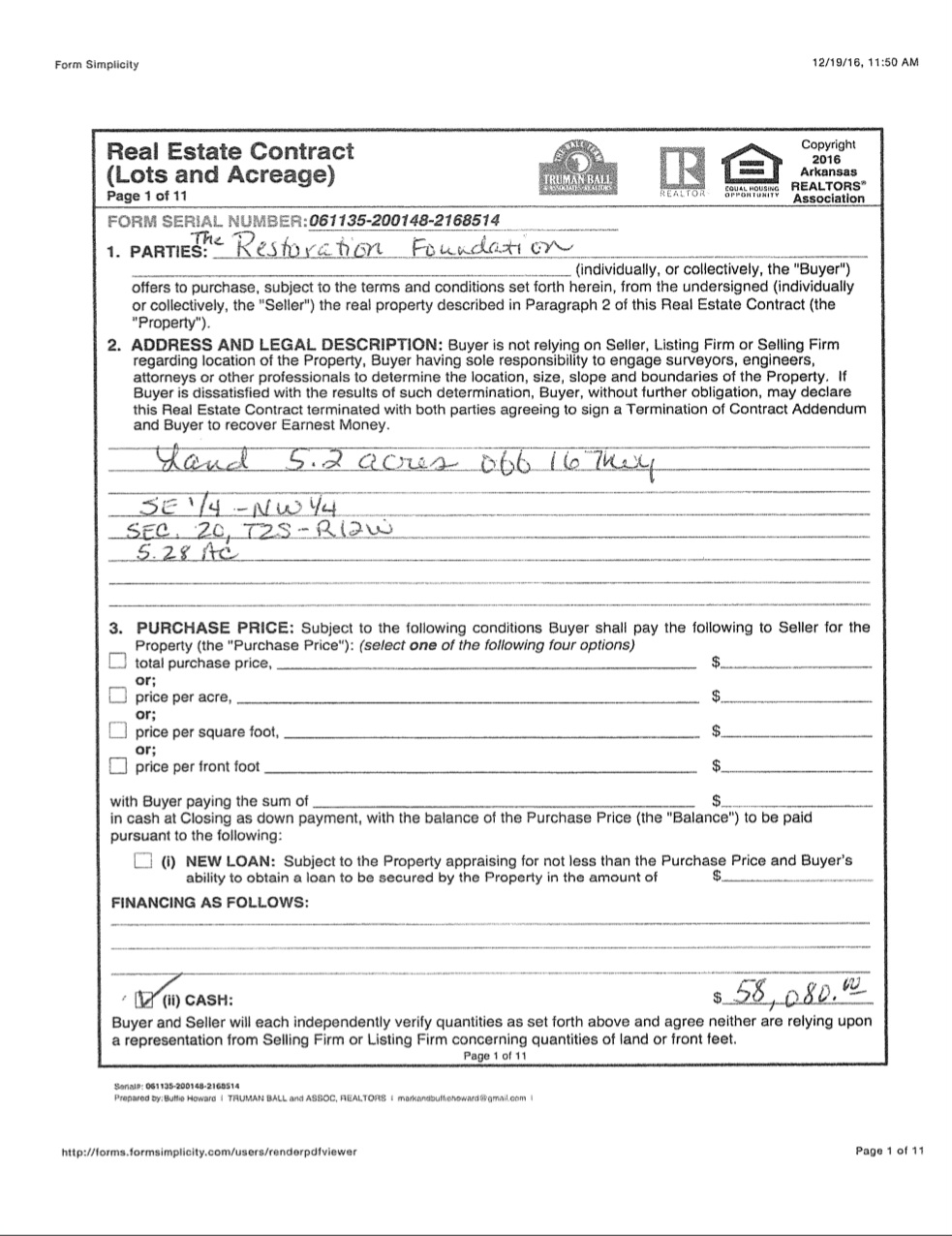 In the 2016 real estate contract concerning the 5.28 acres, the Truman Ball and Associates real estate firm was listed as the “selling firm,” and the “buyer” was The Restoration Foundation.