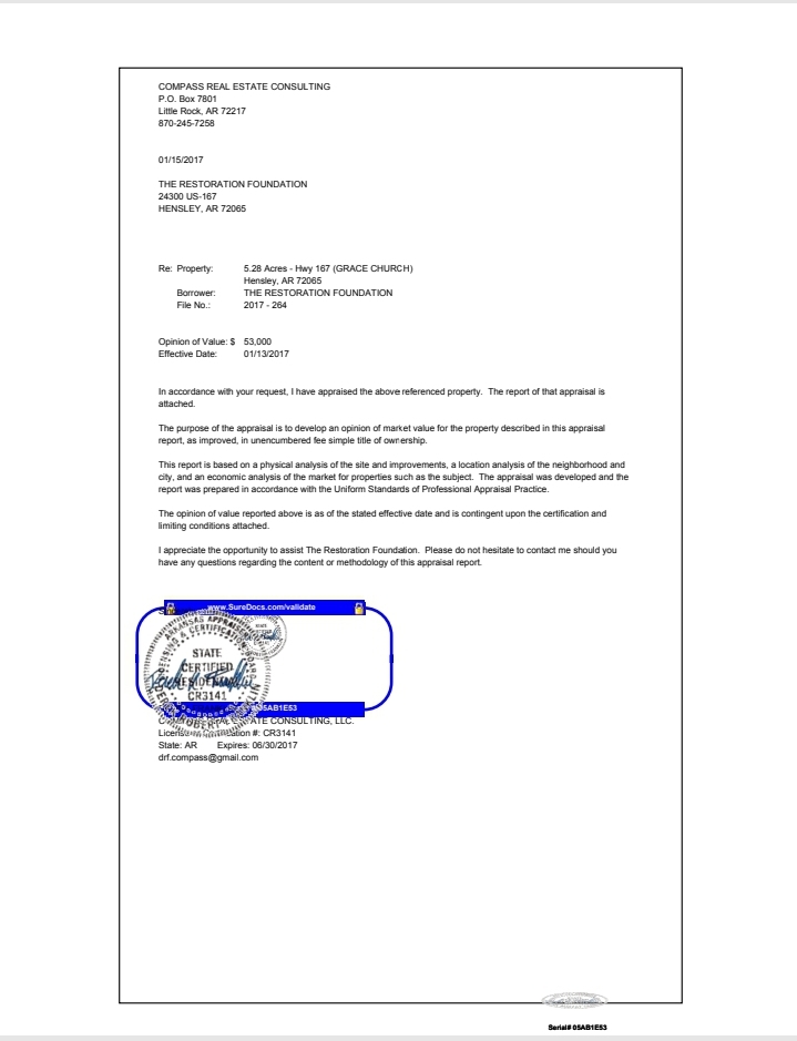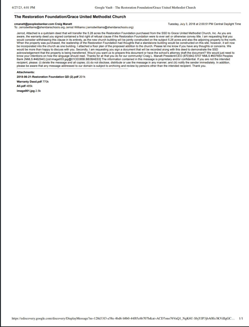 “Jerrod, Attached is a quitclaim deed that will transfer the 5.28 acres the Restoration Foundation purchased from the SSD to Grace United Methodist Church, Inc. As you are aware, the warranty deed you signed contained a first right of refusal clause if the Restoration Foundation were to ever sell or otherwise convey title. I am requesting that you would consider withdrawing this clause in its entirety, as the new church building will be jointly constructed on the subject 5.28 acres and also the adjoining property to the north. When the property was purchased, the leadership of the Restoration Foundation had thoughts that a standalone building would be constructed on this site; however, it will now be incorporated into the church as one building. I attached a floor plan of the proposed addition to the church. Please let me know if you have any thoughts or concerns. We would be more than happy to discuss with you. Secondly, I am requesting you sign a document that will be recorded along with this deed to demonstrate the SSD acknowledgement that the property is being transferred. Would you want us to prepare this document or have the school's attorney draft the document? We would just need to know your intentions on how the language should read. Thanks for all that you do for our community! Craig L. Manatt President/CEO”