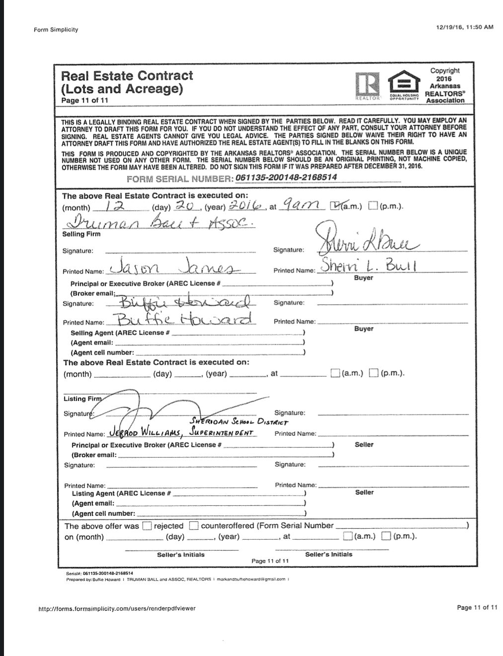 The real estate contract released in May was not signed by then Superintendent Jerrod Williams. After a follow-up email in August asking if all documents related to this transaction had been released, Mayberry sent more documents on August 31 including a signed copy of the real estate contract by Williams.
