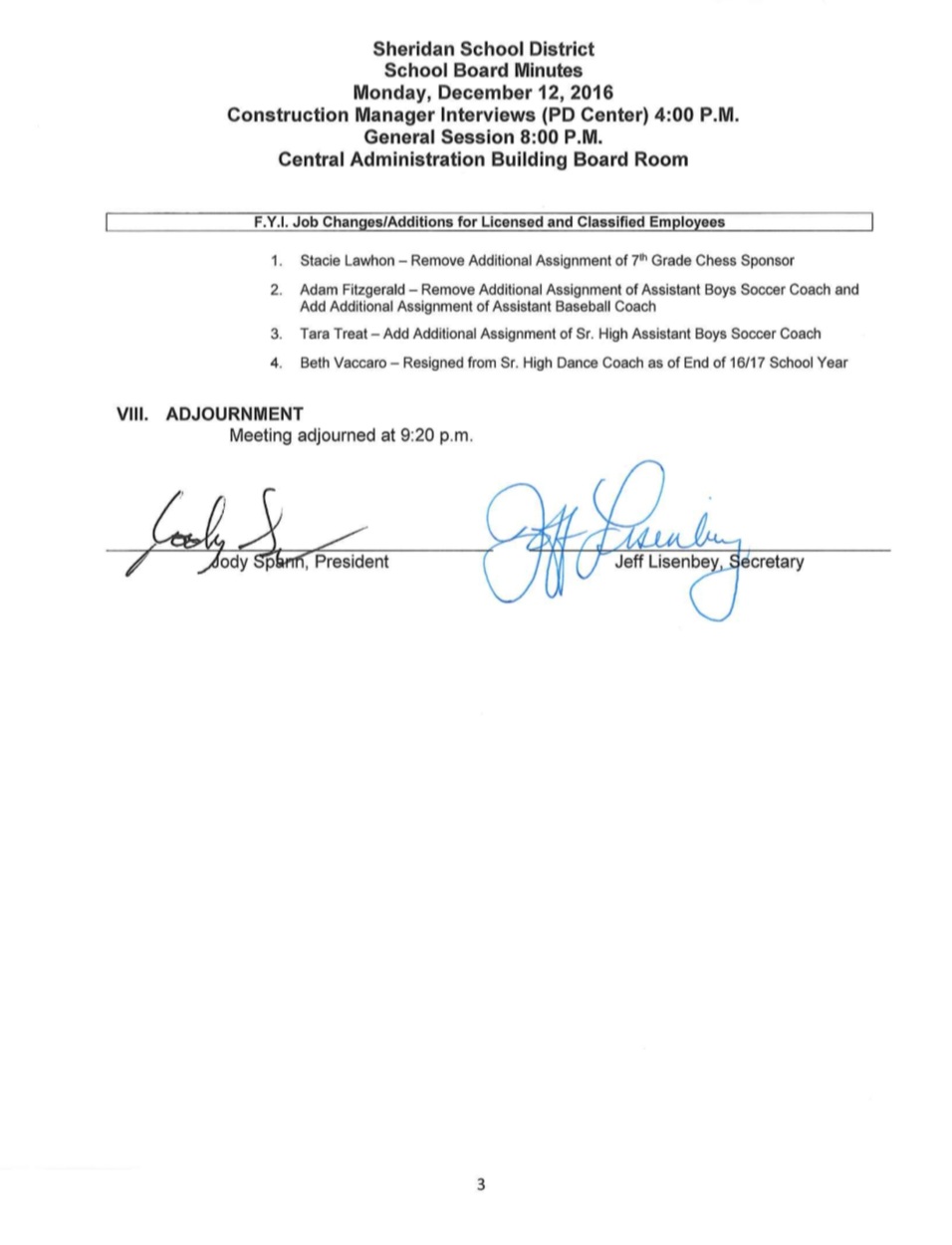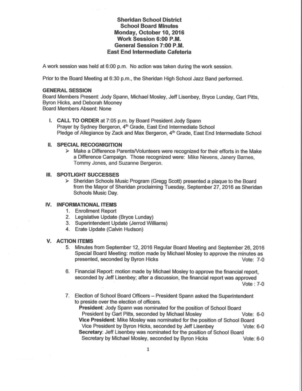 According to the 2023-24 Sheridan School District Board Policy Manual, the school board secretary’s duties shall include: “Being responsible to see that a full and accurate record of the proceedings of the Board are permanently kept and shall; (a.) Record in the minutes, the members present, by name, at the meeting including the time of any member’s late arrival to, or early departure from, a meeting; (b.) Record the outcome of all votes taken including the time at which the vote is taken.”