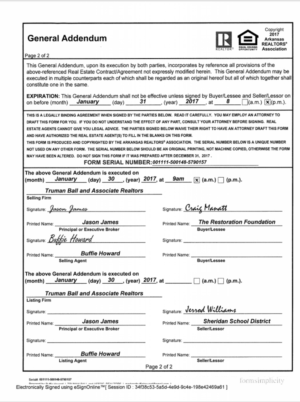 How Truman Ball and Associates entered the picture as the selling firm for a property owned by a public school is unclear. No information was released by the Sheridan School District showing it had contracted its own real estate agent. The real estate contract dated Dec. 20, 2016, indicates Truman Ball represented The Restoration Foundation.