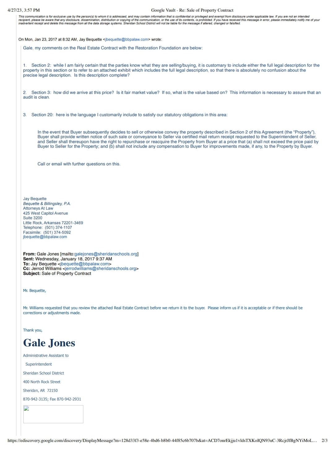 An email exchange occurred Jan. 18, 2017, between Gale Jones, administrative assistant to Superintendent Williams, and Jay Bequette, the school’s attorney.