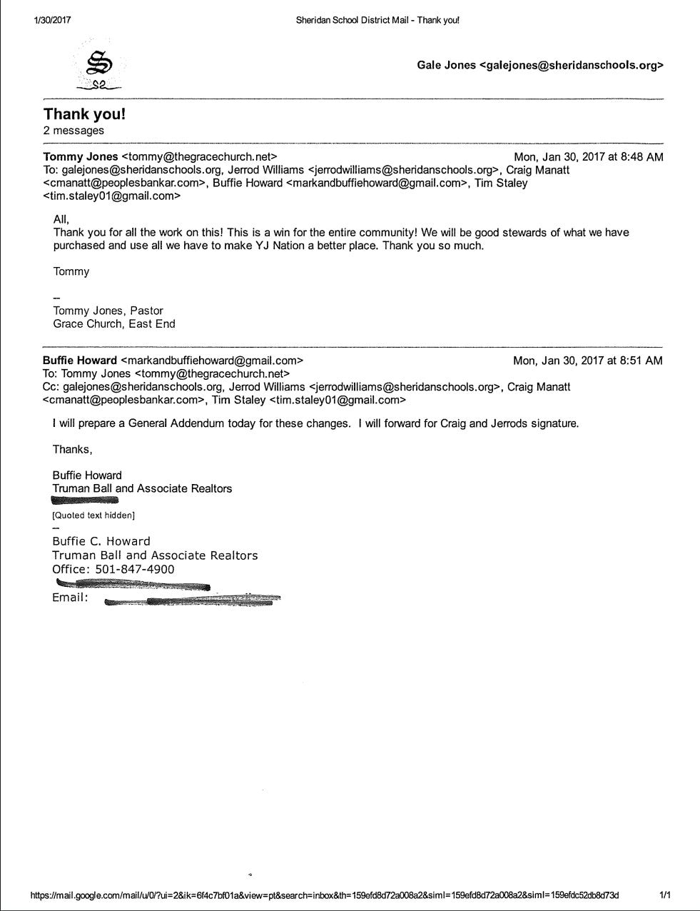 On Jan. 30, 2017, in an email released by Mayberry, Tommy Jones sent an email from his Grace Church email account to Gale Jones and Superintendent Williams. Tommy Jones also copied three other people on the email – Manatt, Buffie Howard with Truman Ball, and Tim Staley, who was connected to the foundation, according to The Restoration Foundation’s filings with the Arkansas Secretary of State.