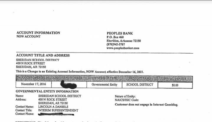 In a document released by Andy Mayberry, a former state representative and the Sheridan School District’s director of communications and recruitment since October 2021, the school opened a construction account for the bond on Nov. 17, 2016, at Peoples Bank in Sheridan.