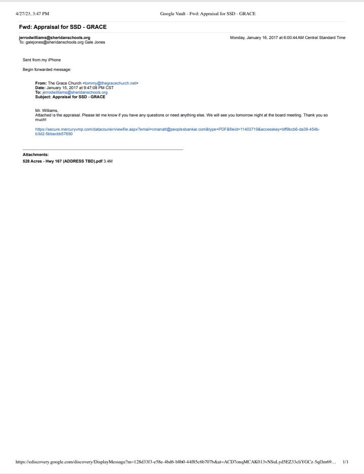On Jan. 15, 2017, at 9:47 p.m. then-Sheridan School District Superintendent Jerrod Williams received an email with the subject line Appraisal for SSD – GRACE from Tommy Jones, an ardent supporter of the millage and lead pastor of Grace Church.