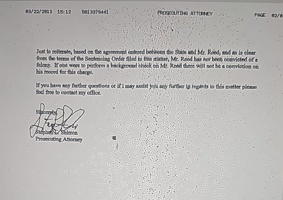 He testified in court he called the governor's office to get his record expunged in 2020 or 2021. Someone in the Governor's office told Reed they could not find any documentation about the case.