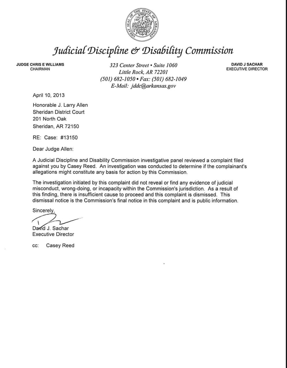 Reed filed a complaint with the Judicial Discipline and Disability Commission against Allen in April 2013. He provided the Reckoning with a copy of the Commission's response.
