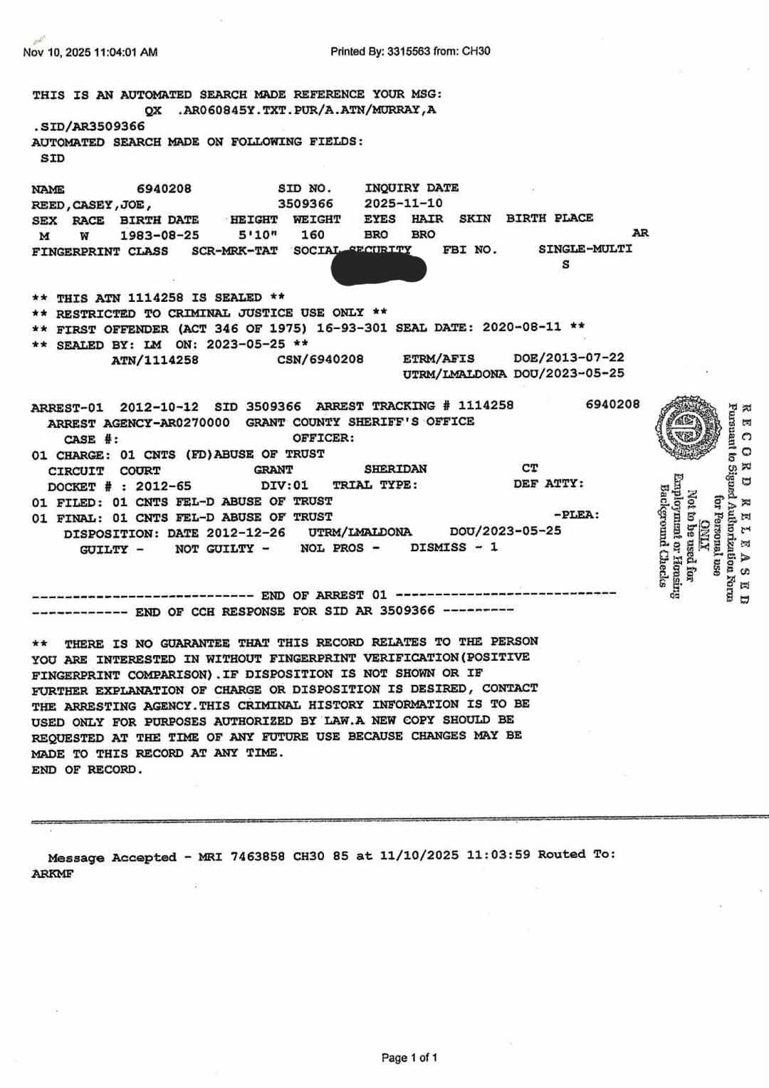 "No conviction has ever been made, and there is no criminal history listed for Casey Reed in ACIC or ASP records," Reed told the Reckoning. "A background check on Reed returns no results. In short, there is no criminal record —no convictions and no felonies."