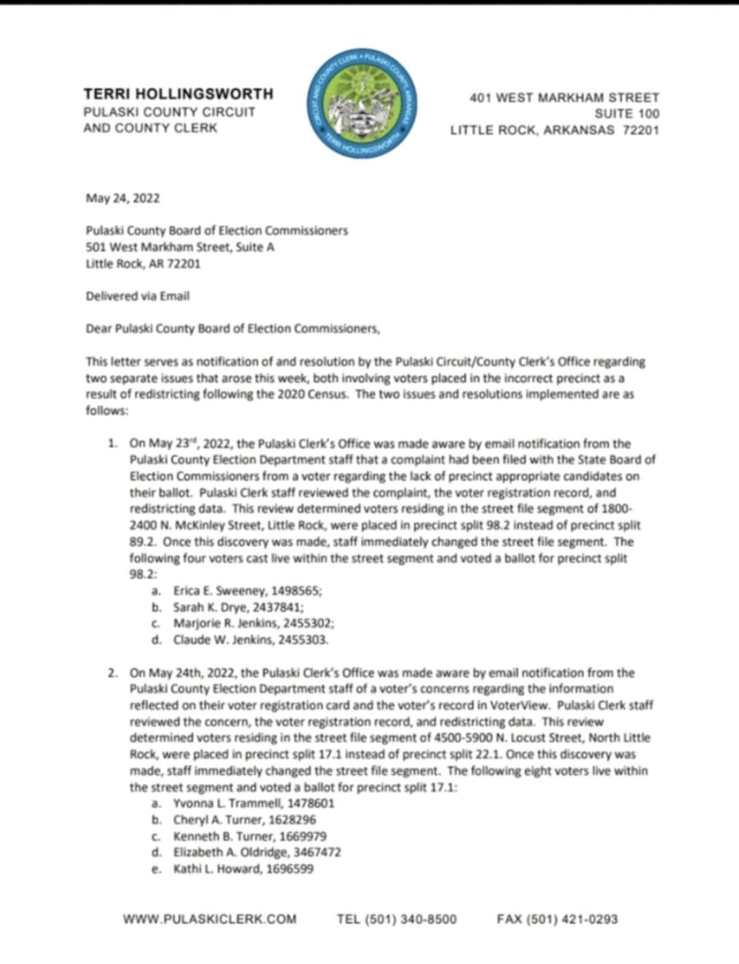 The Pulaski County Election Commissioners by a majority vote also sent citizen complaints to the Arkansas State Board of Election Commissioners, the Arkansas Attorney General's Election Integrity Unit and the Pulaski County Prosecuting Attorney at the same meeting.