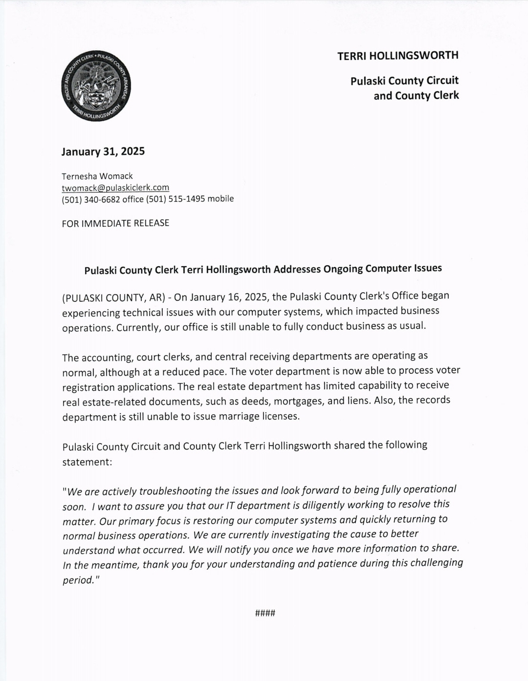 On Jan. 16, 2025, according to a press release from Hollingsworth, addressed “Ongoing Computer Issues.”