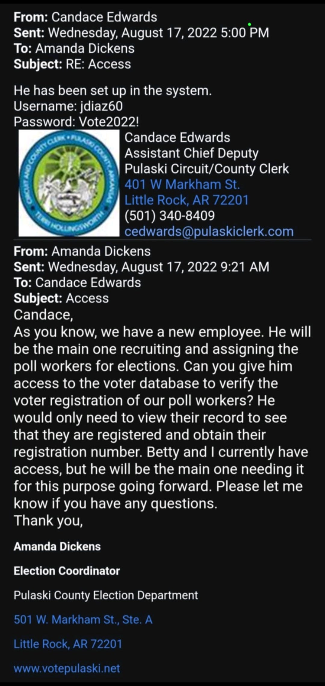 A 2022 email exchange between Election Coordinator Amanda Dickens and Assistant Chief Deputy Pulaski County Clerk Candace Edwards revealed a username and password exchange via email that allowed an employee access to “the voter database to verify the voter registration of our poll workers.”