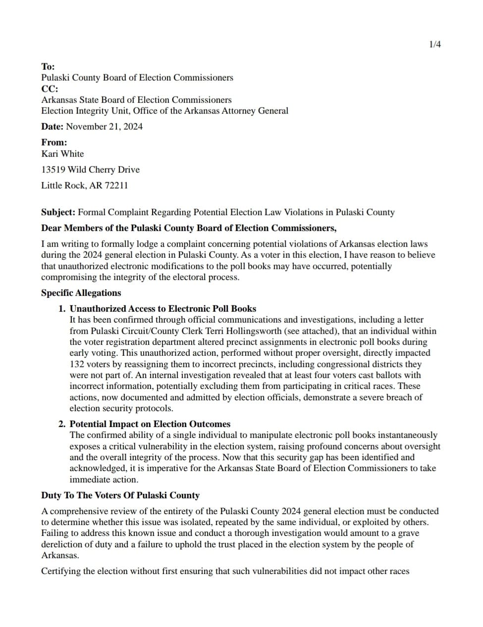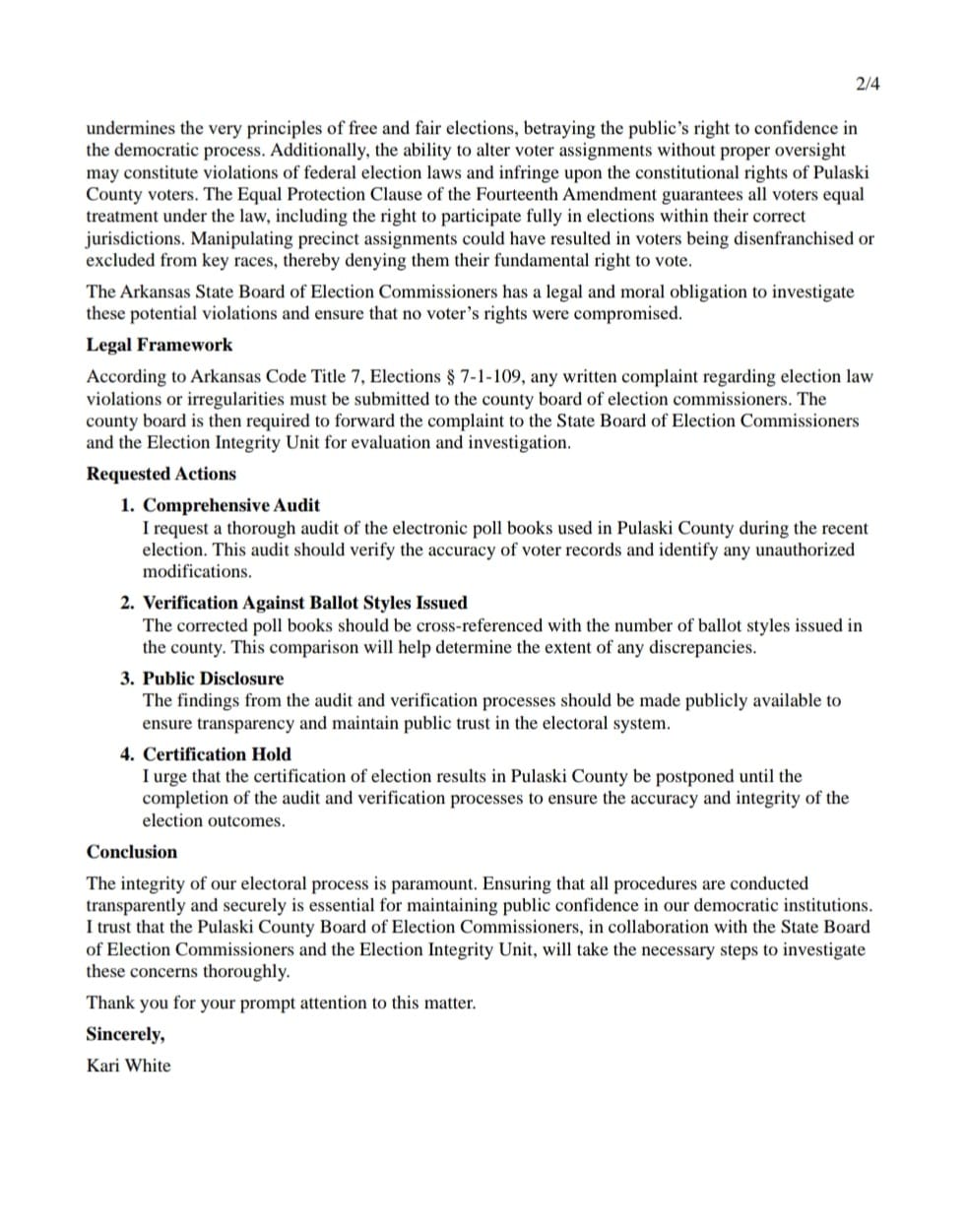 To date no official report has been issued by the State Board of Election Commissioners concerning the original filed complaints in November into the 2024 Pulaski County Election.