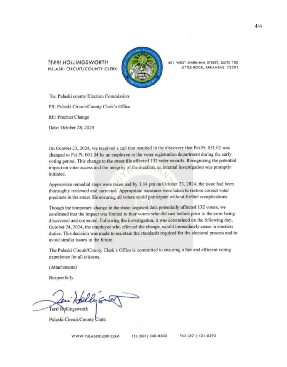Pulaski County Clerk Terri Hollingsworth’s office gave documents, including a letter to the Pulaski County Election Commissioners, advising that the change had only affected four voters before it was remedied. The employee who made the change was relieved of her election duties, according to the letter.
