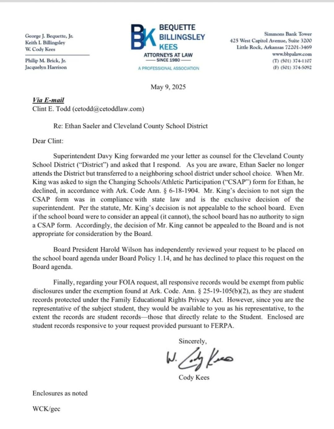 The Reckoning obtained a copy of the May letter from Cody Kees, the Cleveland County School District's attorney, informing Todd that he would not be placed on the school board agenda to discuss this matter.
