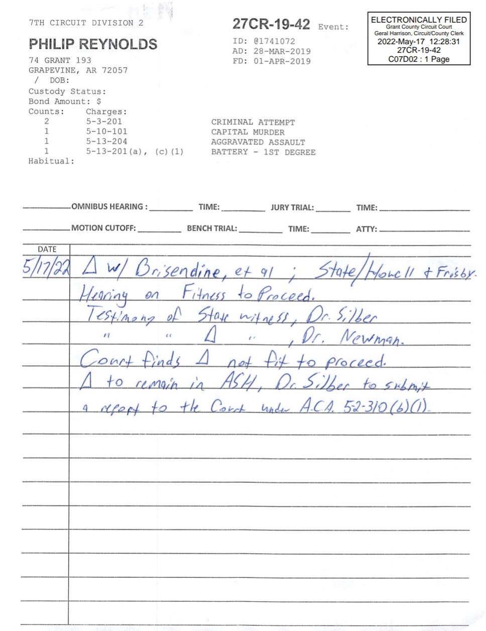 By May 2022, a Judge Note states Reynolds was not fit to proceed based on testimony in a hearing.