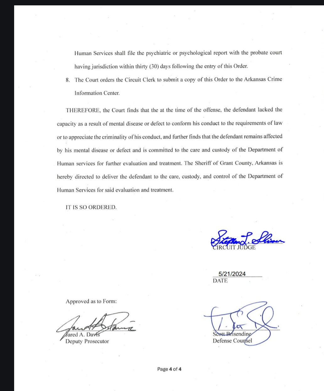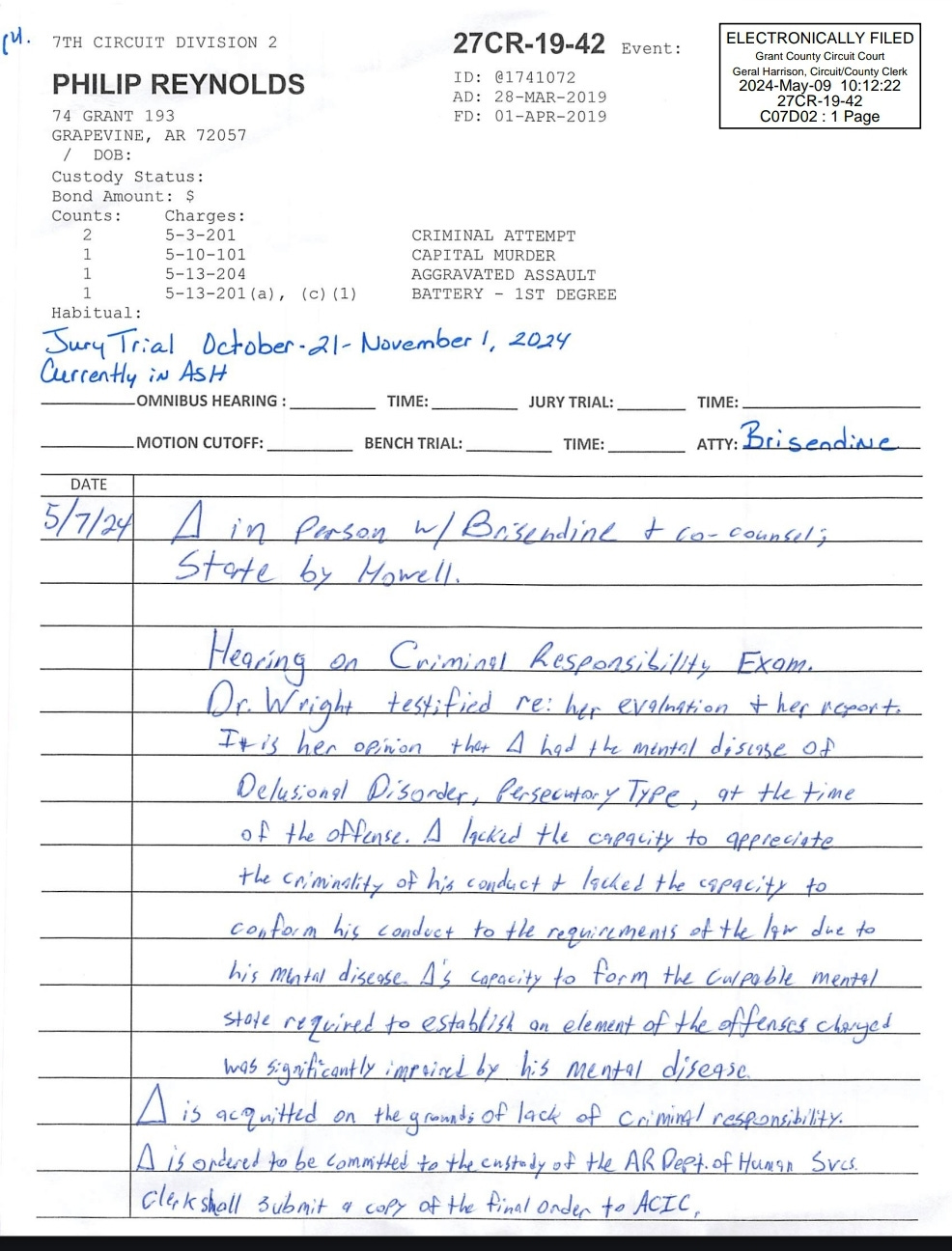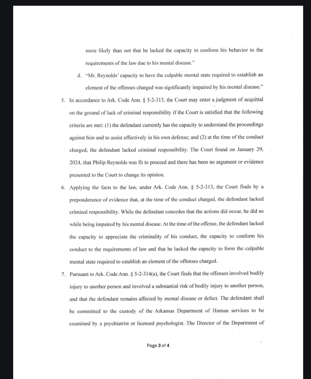 Shirron wrote in a Judge Note that Reynolds is “ordered to be committed to the custody of the AR Dept. of Human Svcs.” The clerk will submit a copy of the final order to the Arkansas Crime Information Center.