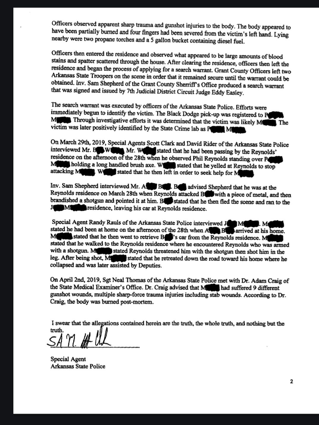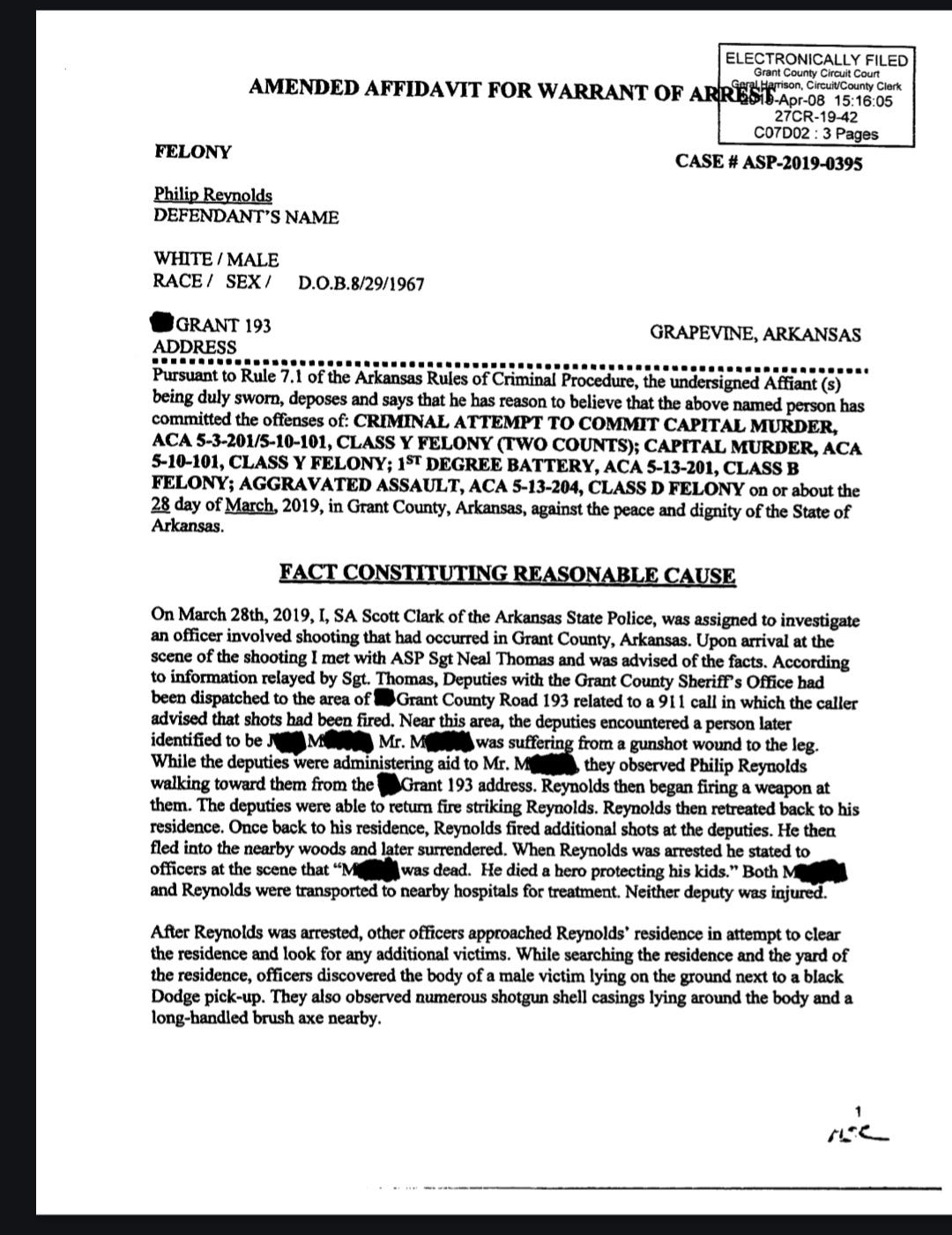 On March 28, 2019, an agent from the Arkansas State Police was assigned to investigate an officer involved shooting that occurred in Grant County. Deputies with the Grant County Sheriff's Office had been dispatched to the area of 74 Grant County Road 193 related to a 911 call in which the caller advised that shots had been fired, Near this area, deputies encountered a person later identified as Jerry Mauldin. Mr. Mauldin was suffering from a gunshot wound to the leg. While the deputies were administering aid to Mr. Mauldin, they observed Philip Reynolds walking toward them from the 74 Grant 193 address. Mr. Reynolds then began firing a weapon at them. The deputies were able to return fire striking Reynolds. Mr. Reynolds then retreated to his residence where he fired additional shots at the deputies. He then fled into the nearby woods and later surrendered. When Mr. Reynolds was arrested, he stated to officers that “Massey was dead. He died a hero protecting his kids.” Both Mr. Mauldin and Reynolds were transported to nearby hospitals for treatment. Neither deputy was injured.
