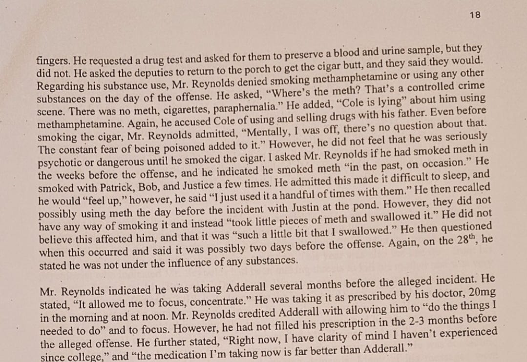 The evaluation also stated: “In 2011, Mr. Reynolds was diagnosed with Amphetamine Abuse and Psychotic Disorder NOS due to periodic meth use. He stated that he continued to go to his friend Tyrone’s house to smoke meth, which he began smoking about one year before.”
