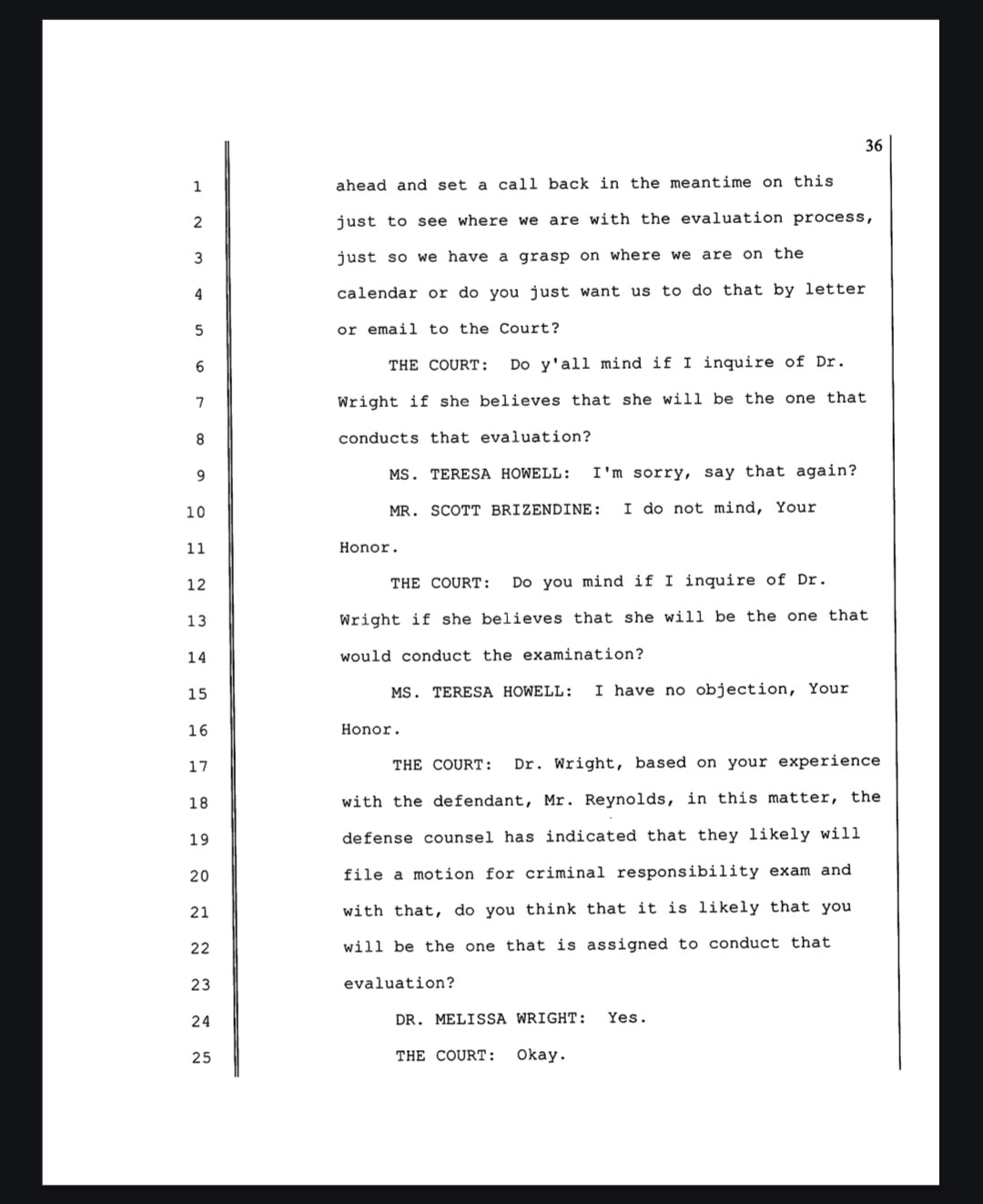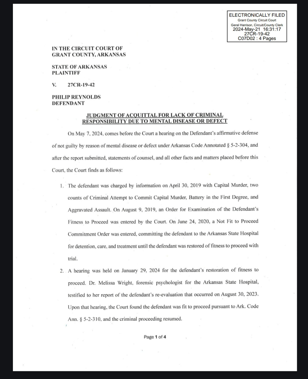 At the May 7 hearing, Circuit Court Judge Stephen Shirron ruled — based on Wright's March evaluation of Reynolds and her in-person testimony — that Reynolds “is acquitted on the grounds of lack of criminal responsibility.”