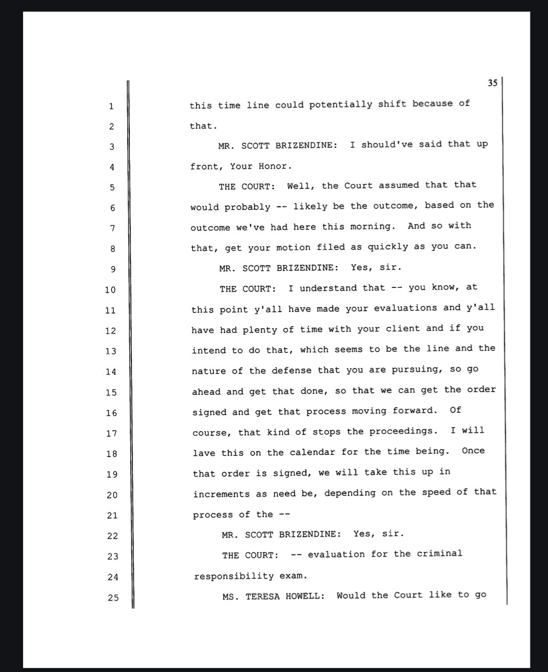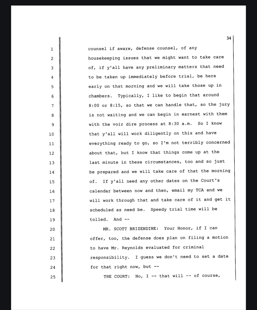 A motion hearing was scheduled. A jury trial was set to begin on Oct. 21 and end Nov. 1. At the January hearing the court and attorneys discussed the potential defense of “Criminal Responsibility.”