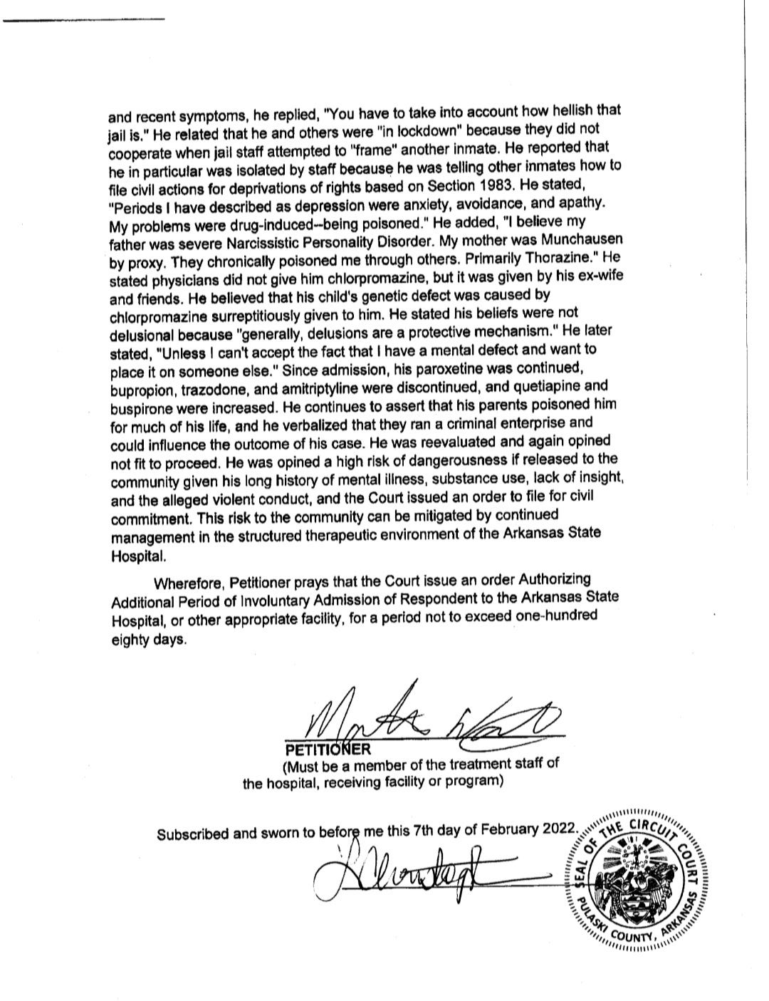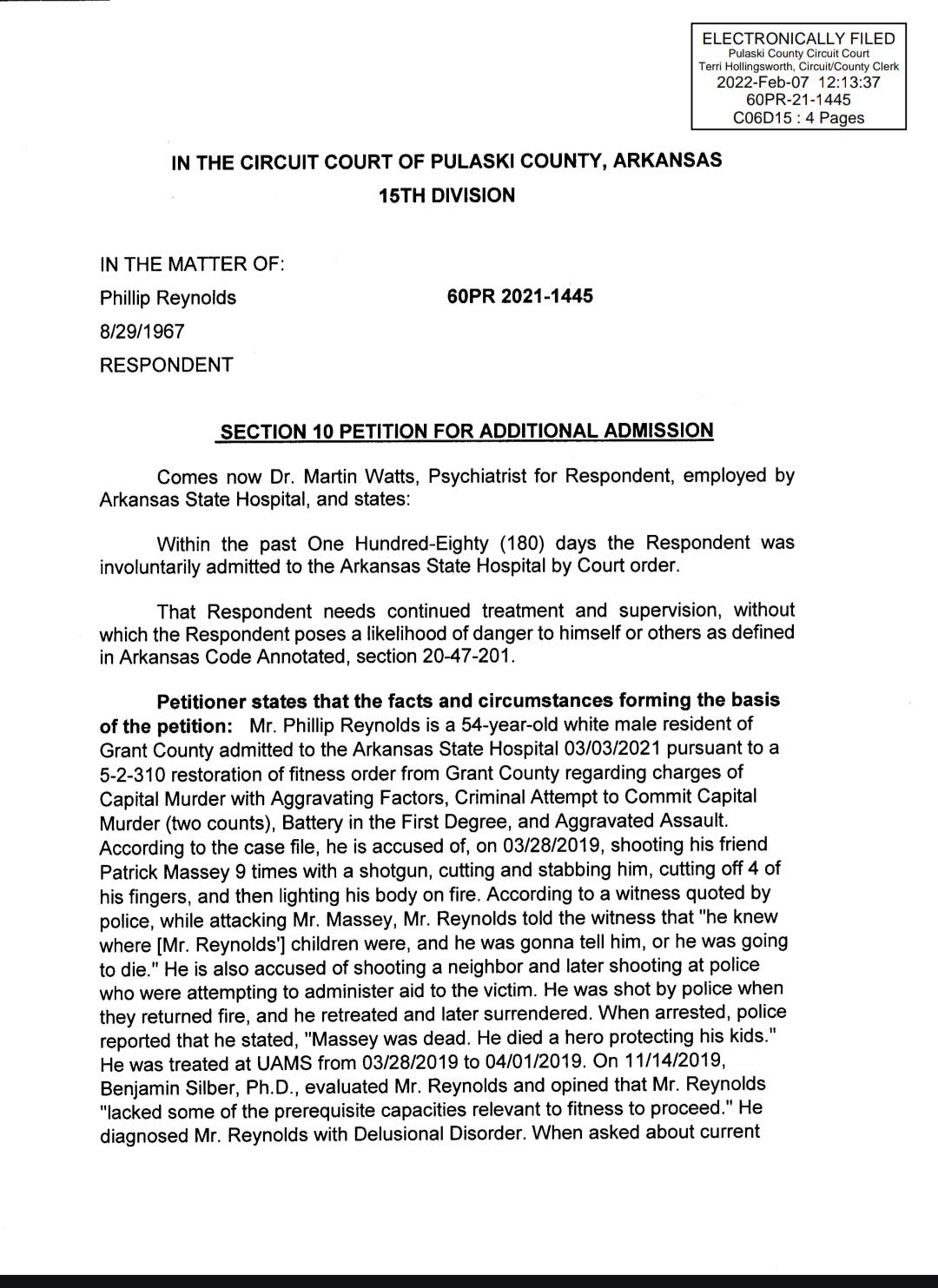In a Feb. 7, 2022, document filed in the Circuit Court of Pulaski County, Dr. Martin Watts, a psychiatrist with the Arkansas State Hospital, noted that Reynolds “needed continued treatment and supervision”. This document also explains more about the events of March 28, 2019, when Reynolds allegedly killed Massey.