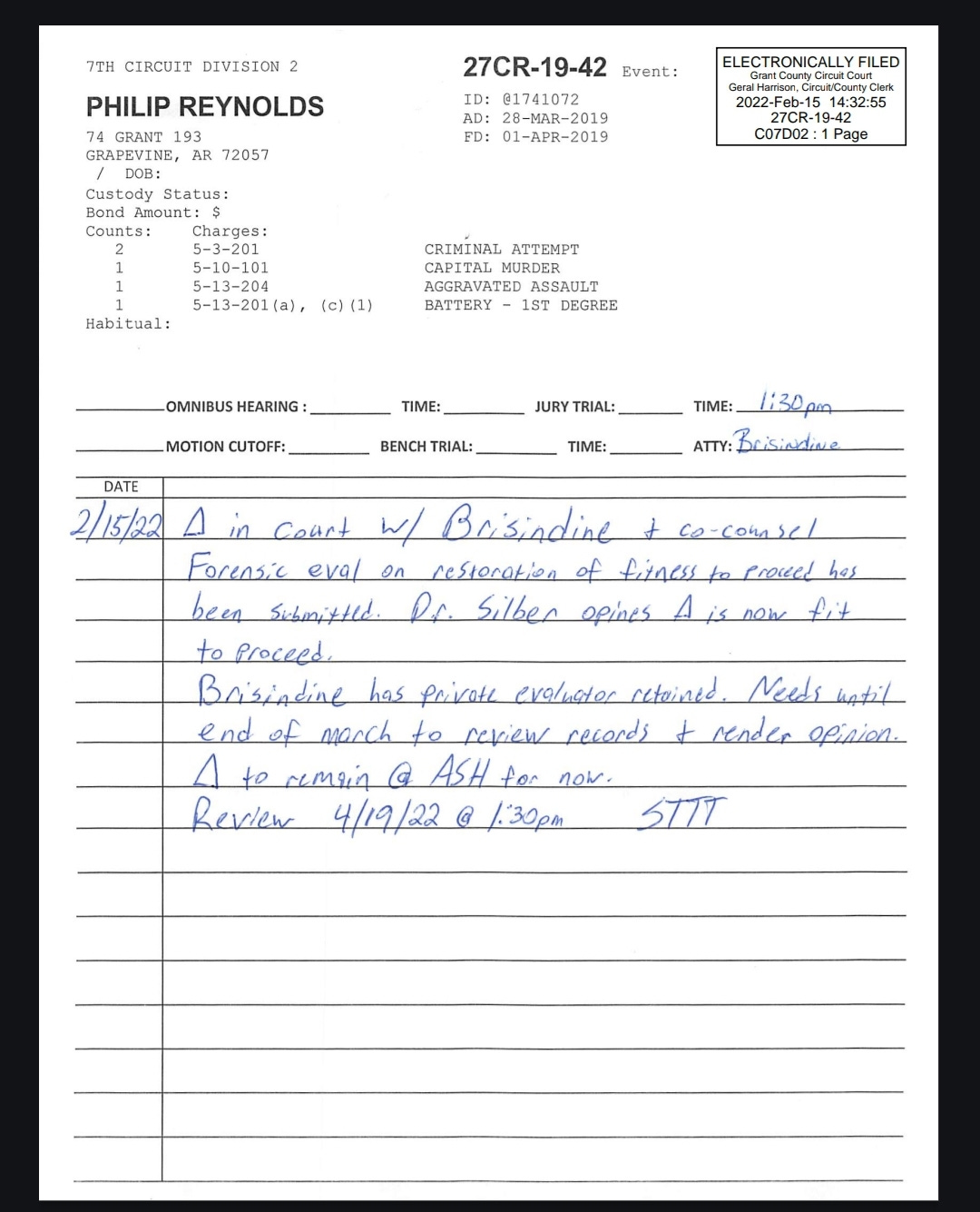A February 15, 2022, a Judge Note states Reynolds was fit to proceed based on an evaluation.