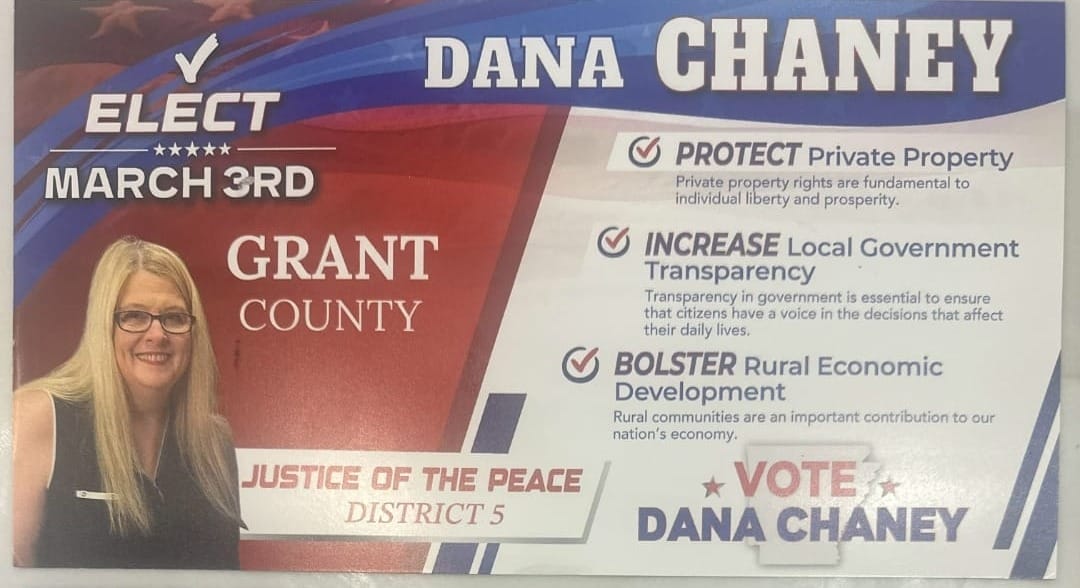 Grant County residents are receiving a similar mailer about Dana Chaney who is running for Justice of Peace against Brody Channell, a vocal opponent against the data center.