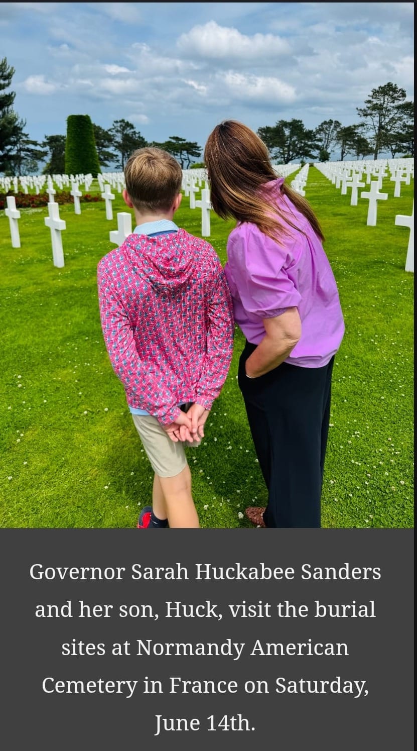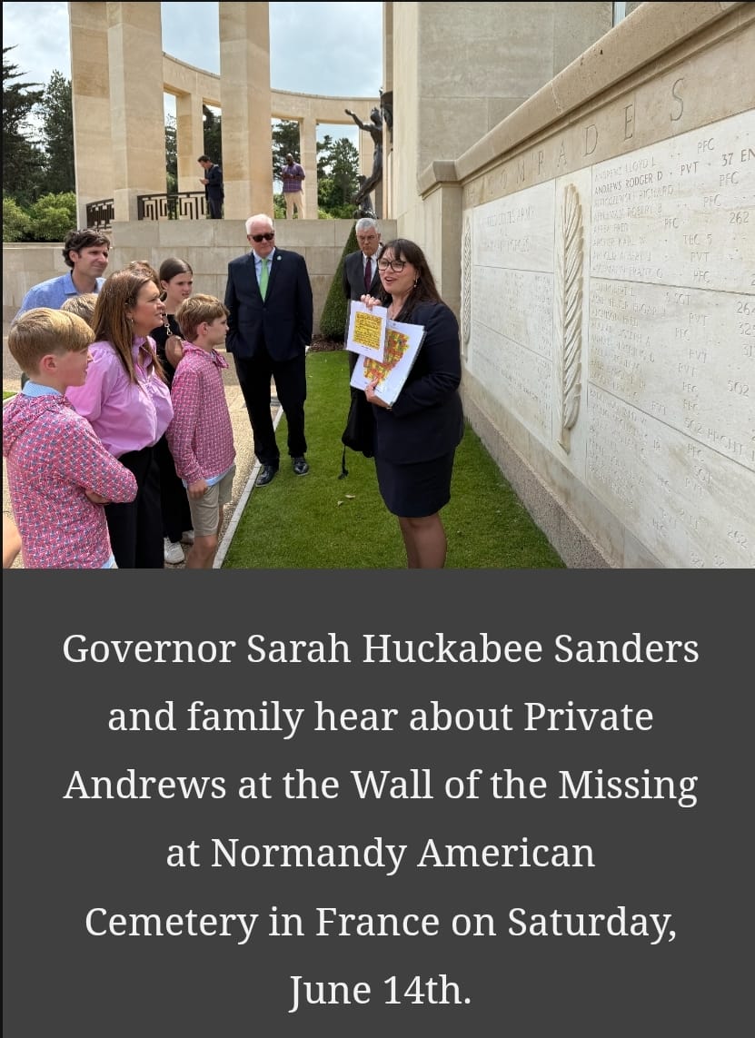 "Over the weekend, Governor Sarah Huckabee Sanders with First Gentleman Bryan Sanders and their kids, visited the Normandy American Cemetery to lay a wreath at The Wall of the Missing in memory of Private Roger Dean Andrews and pay their respects to other fallen Arkansans."