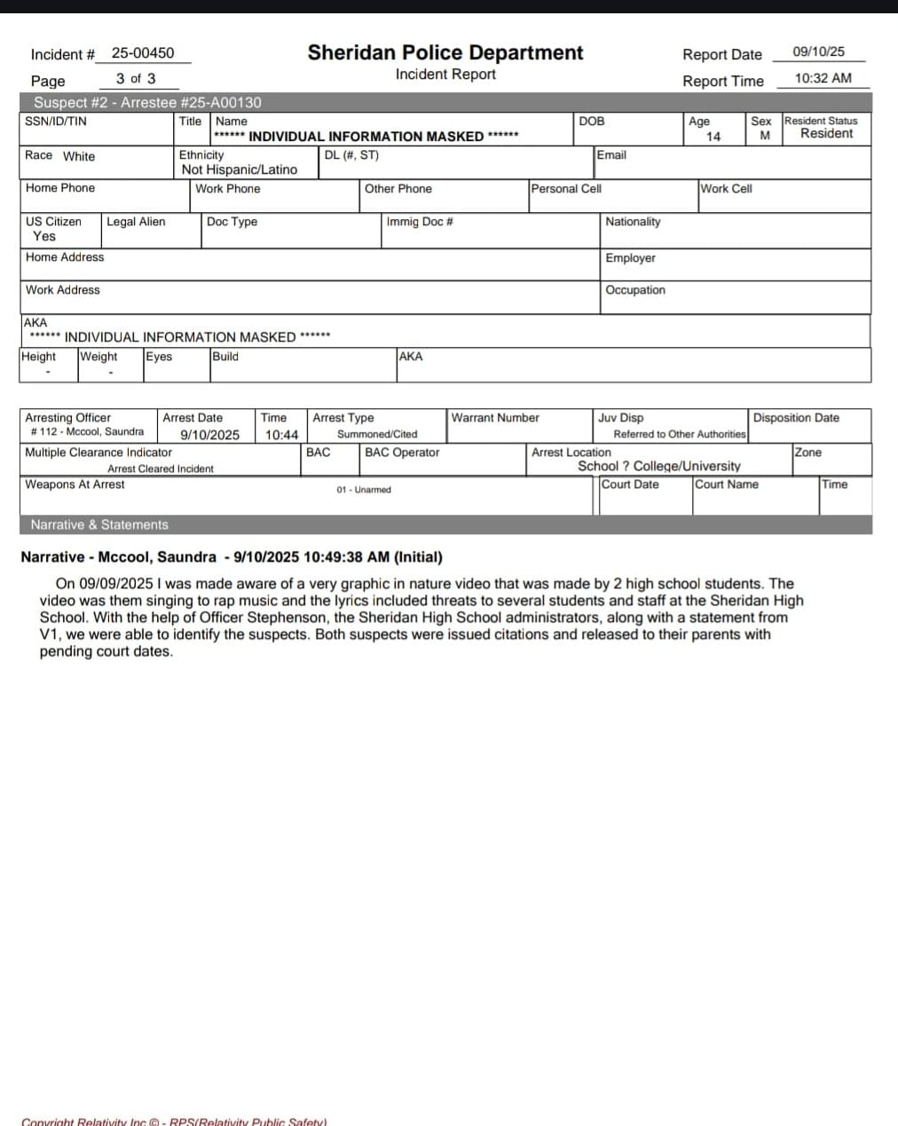 An incident report has been filed with the Sheridan Police Department concerning the vulgar and threatening rap audio that targeted students in the Sheridan School District.