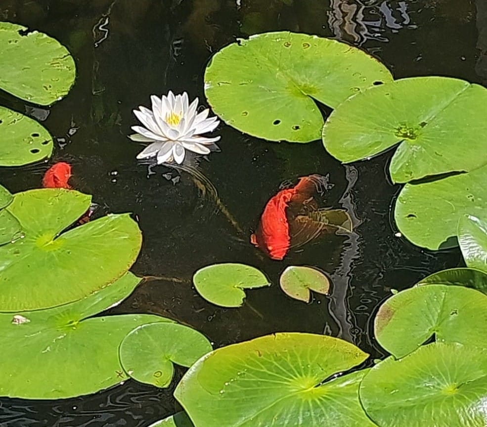 A bridge beside a koi pond with lily pads offers a brief respite from the hectic world.