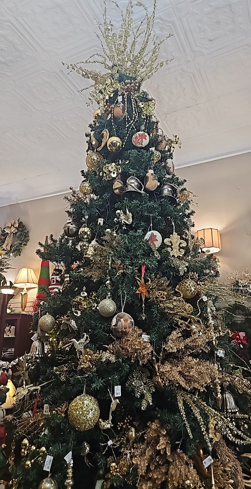 The funeral room also doubles as a Christmas room with lavishly decorated trees that touch the building's antique tin ceiling.