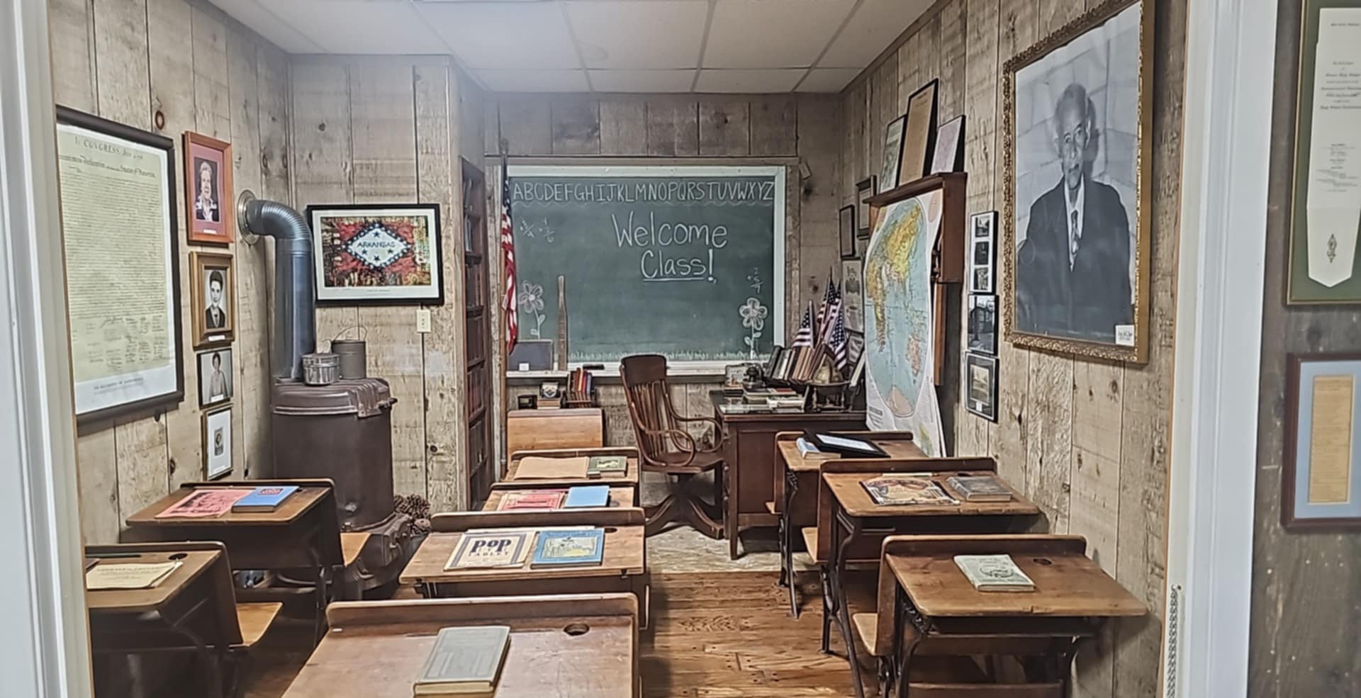 The museum's classroom exhibit immediately captured our attention with its wooden school desks, old world maps, a well-used paddle and even a wood burning stove.
